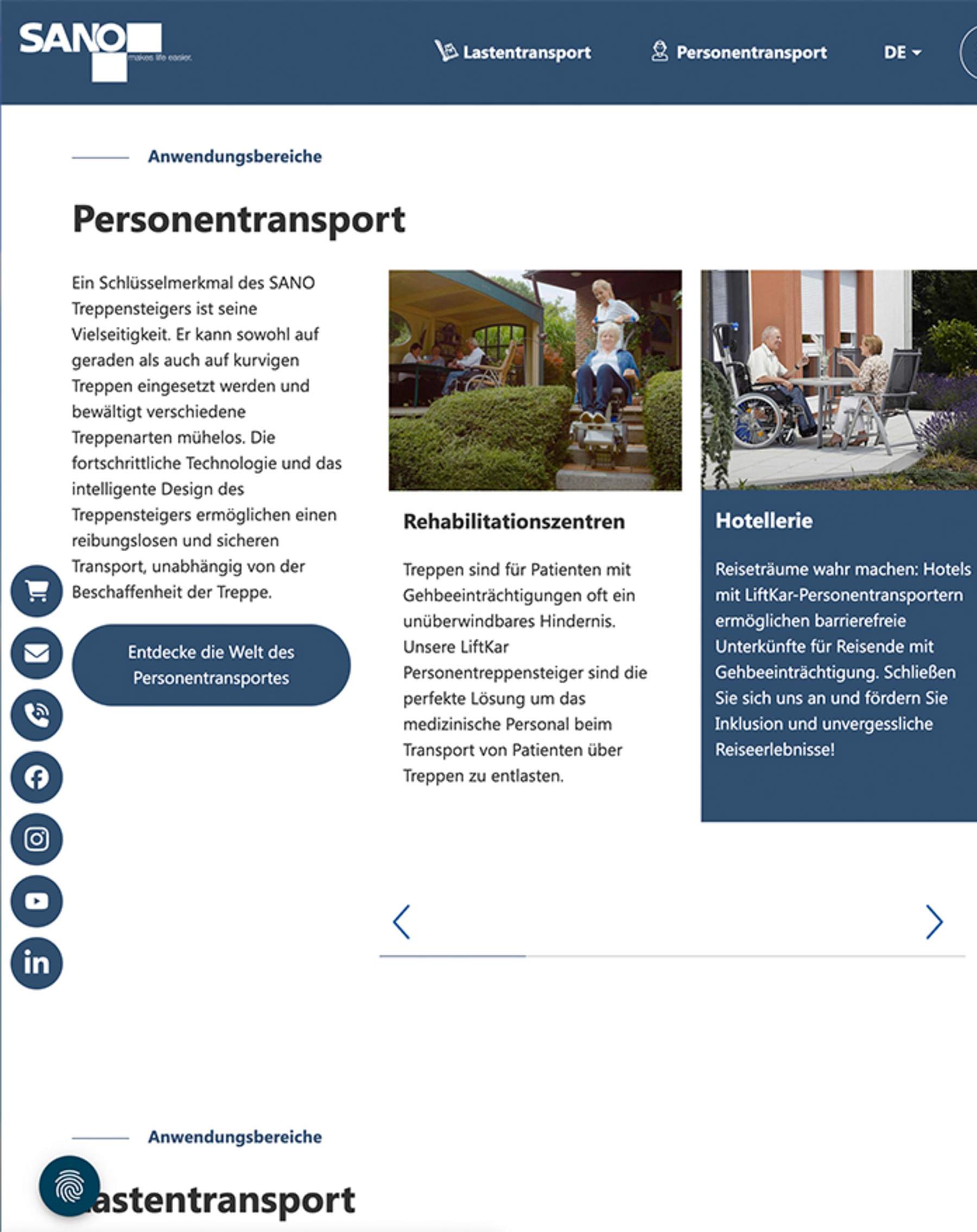 Mit der Neugestaltung und technischen Weiterentwicklung der internationalen Website von SANO Stairclimbers durften wir ein umfangreiches Digitalprojekt begleiten, das sowohl funktional als auch strategisch auf die globalen Anforderungen des Unternehmens ausgerichtet ist. Die modernisierte Plattform stärkt die internationale Markenpräsenz und schafft gleichzeitig eine robuste technische Basis für zukünftige Erweiterungen.